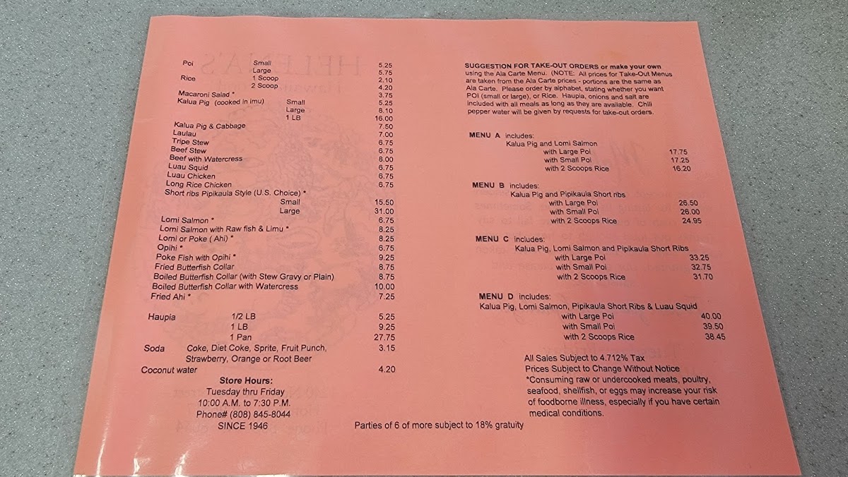 Welcome to Helena's Hawaiian Food, a beloved establishment nestled in the heart of Honolulu at 1240 N School St. Since its inception in 1946, this culinary gem has become an institution, celebrated for its authentic Hawaiian fare and warm, welcoming Aloha spirit. Helmed by the passionate Mr. Craig Katsuyoshi, Helena’s offers a delightful array of traditional dishes that pay homage to the rich cultural tapestry of Hawaii.